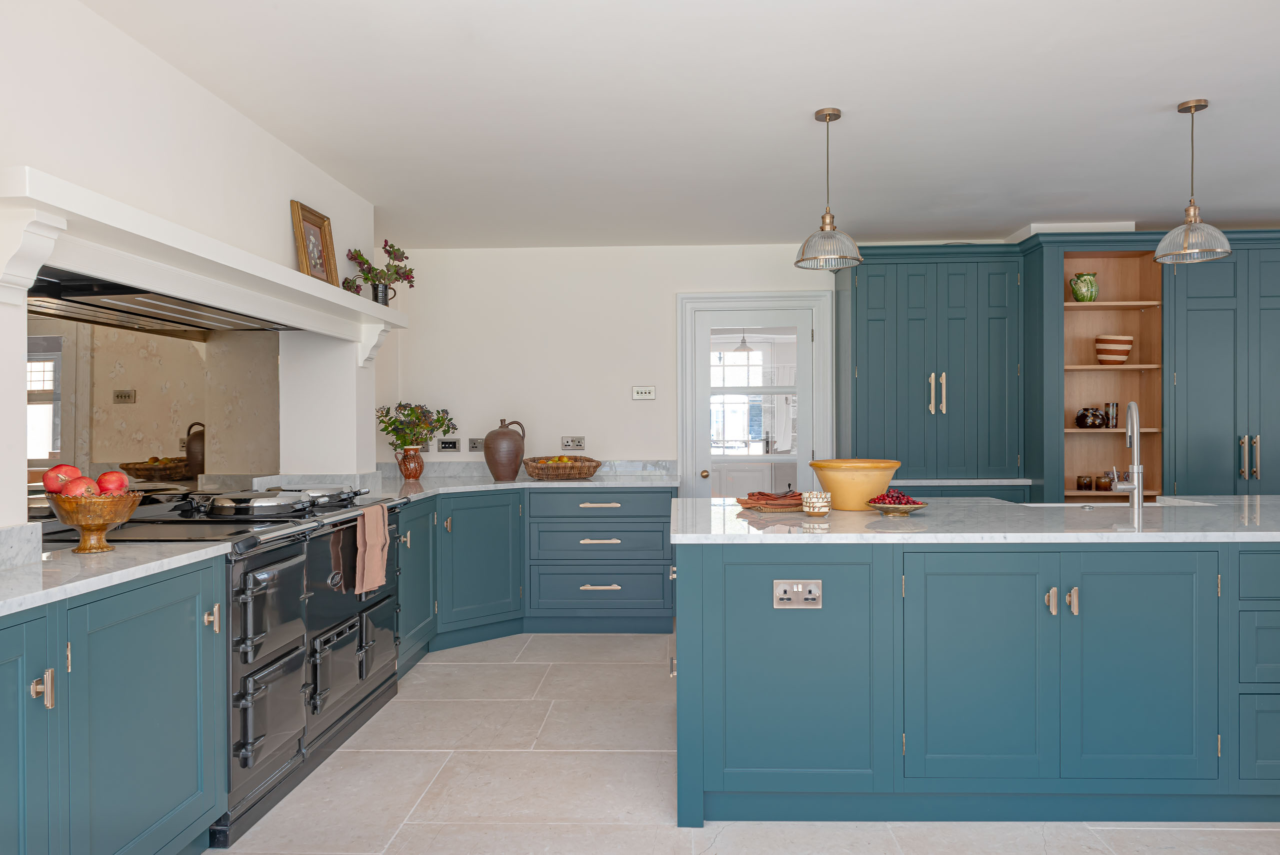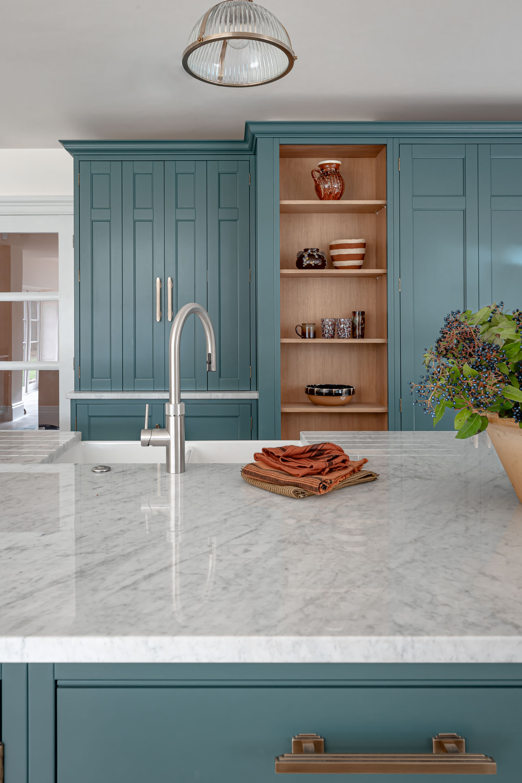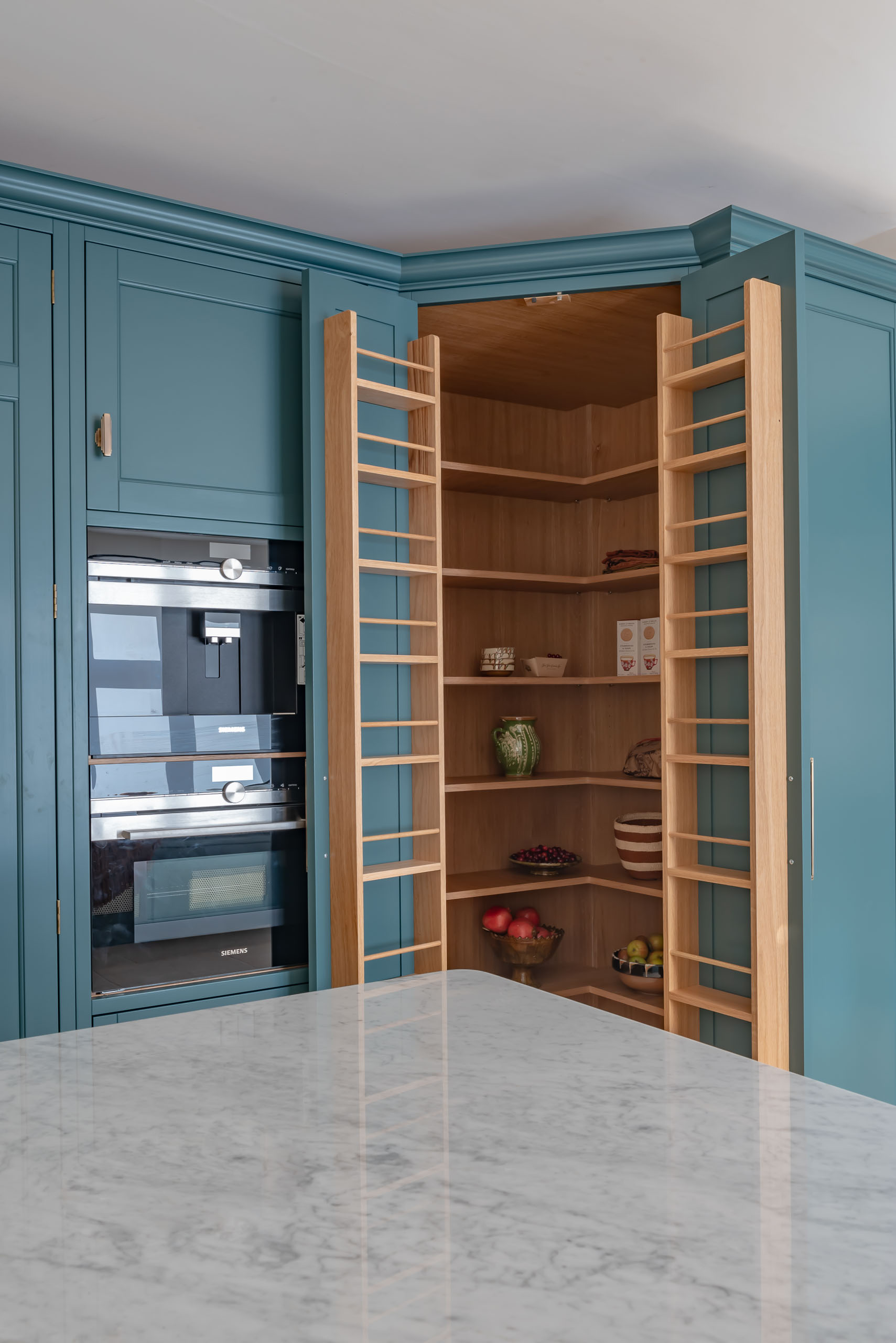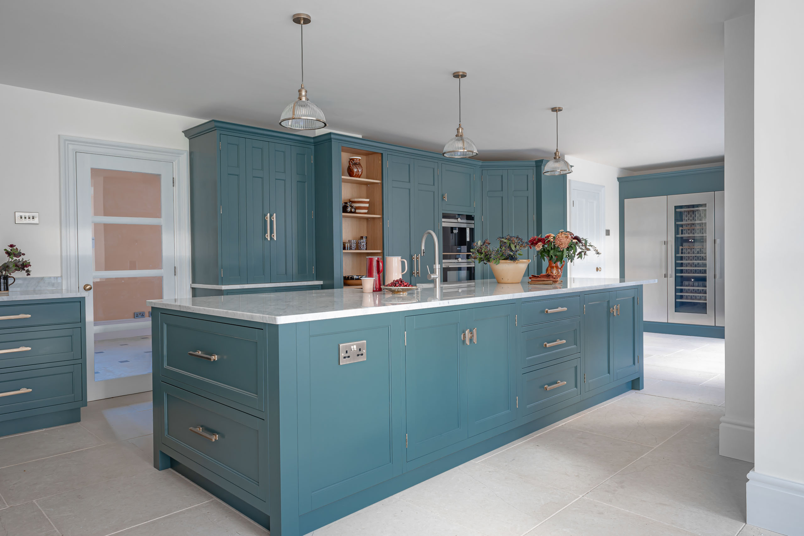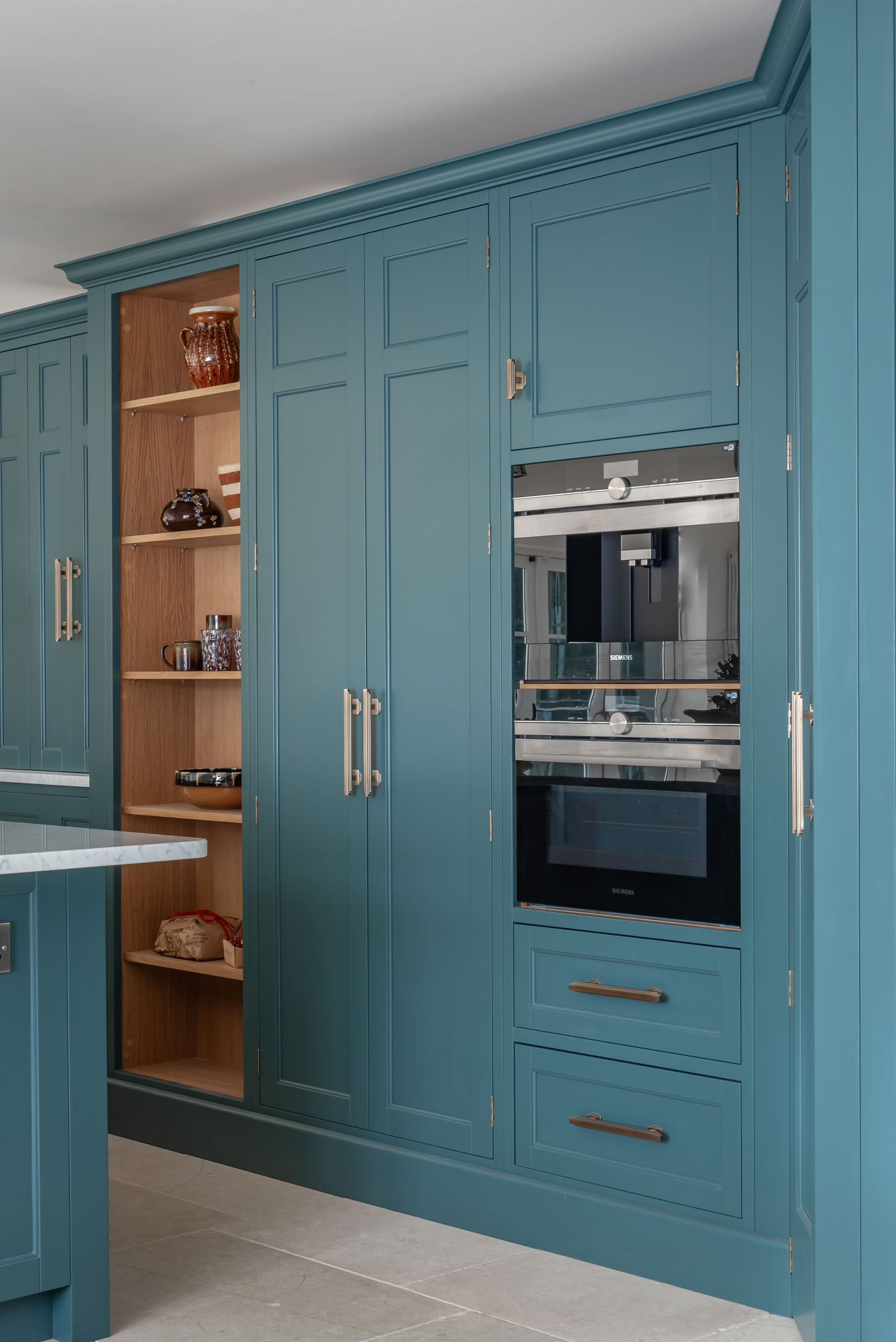 Step into an updated kitchen from our Period English Collection, hand-painted in Farrow & Ball Oval Room Blue. The central island takes centre stage, perfect for meal prep and gatherings. Additional features include a tall corner walk-in larder, a spacious 4-door pantry cupboard, and various bespoke fitted drawers. The inclusion of a dog corner adds a charming touch. This redesigned space effortlessly combines traditional charm with modern functionality. Quality appliances, like the Quooker Flex, and Fitzrovia brushed brass hardware enhance both function and style, resulting in a practical yet refined kitchen.