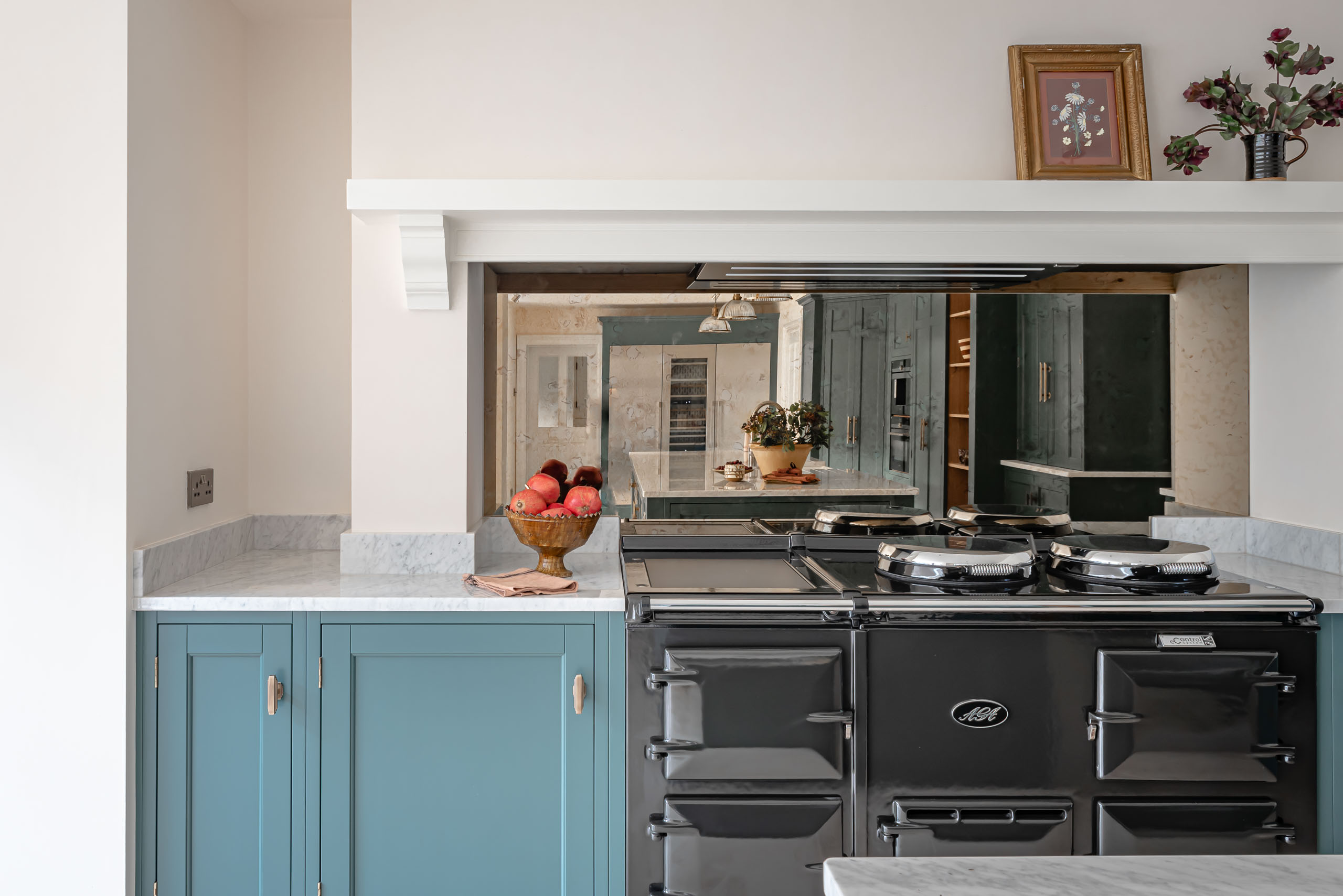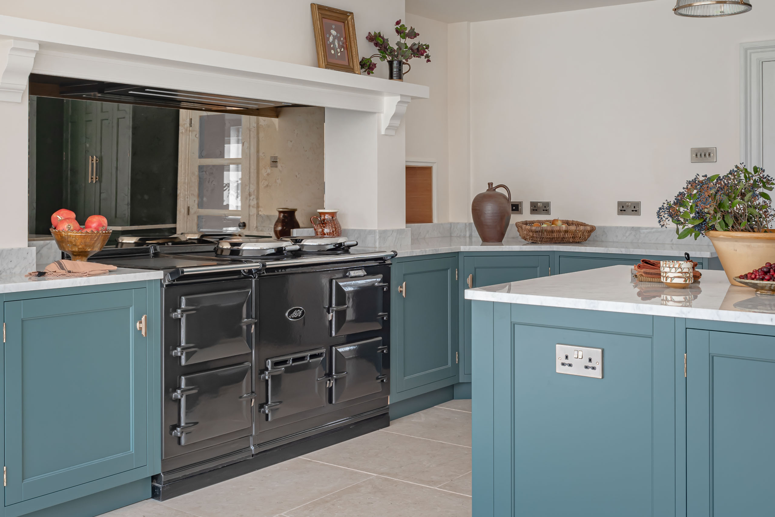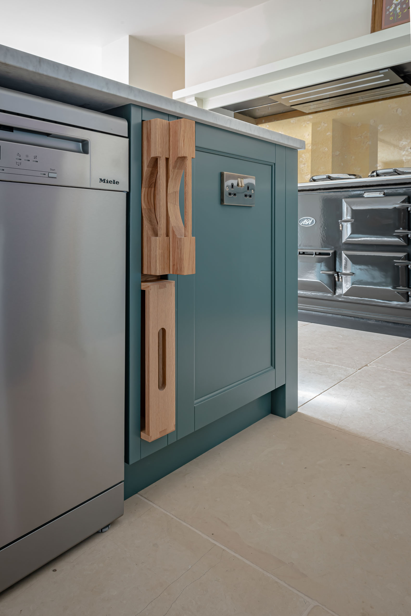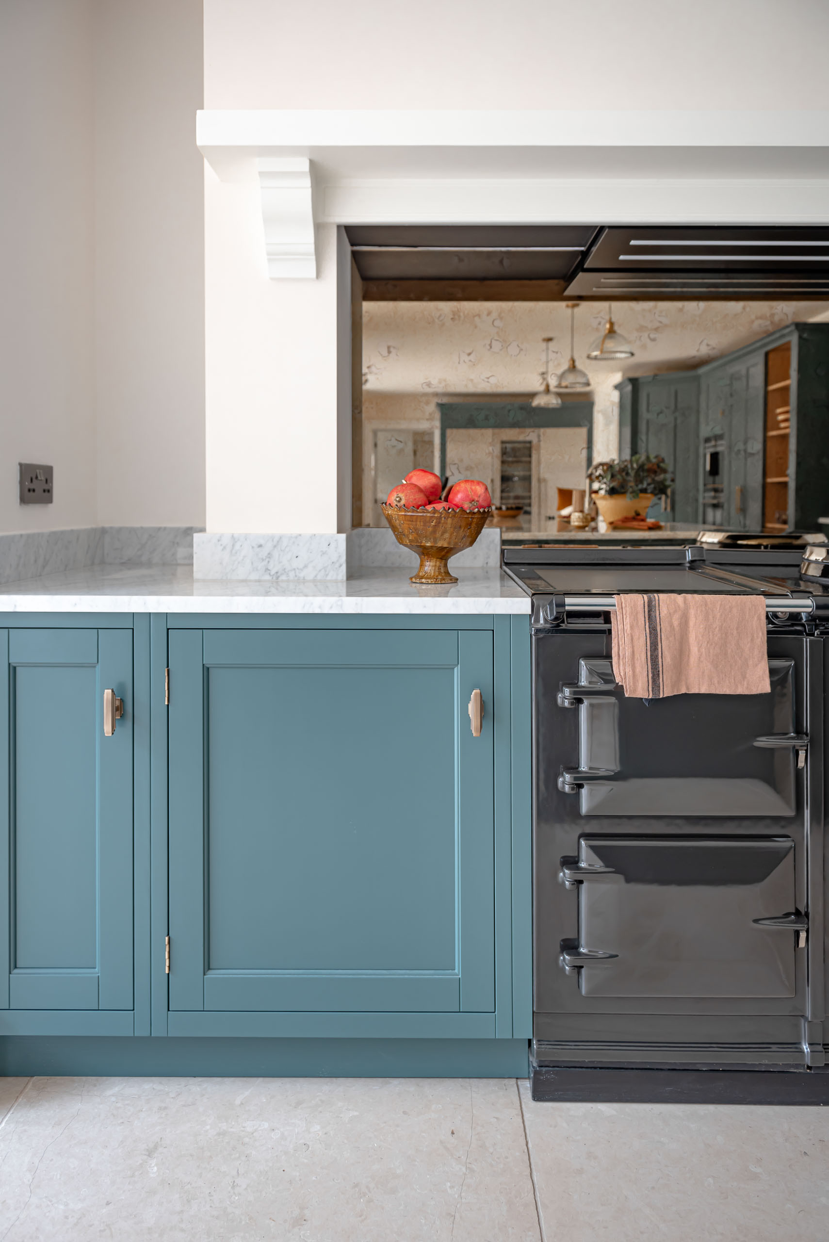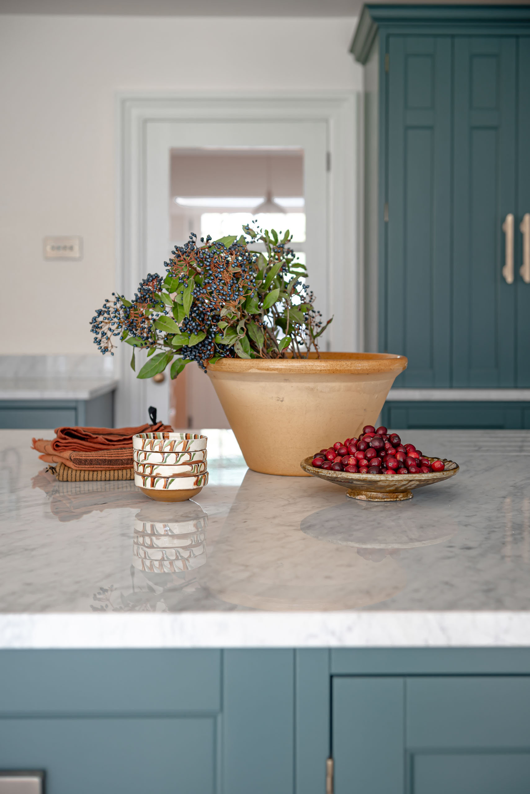 Step into an updated kitchen from our Period English Collection, hand-painted in Farrow & Ball Oval Room Blue. The central island takes centre stage, perfect for meal prep and gatherings. Additional features include a tall corner walk-in larder, a spacious 4-door pantry cupboard, and various bespoke fitted drawers. The inclusion of a dog corner adds a charming touch. This redesigned space effortlessly combines traditional charm with modern functionality. Quality appliances, like the Quooker Flex, and Fitzrovia brushed brass hardware enhance both function and style, resulting in a practical yet refined kitchen.