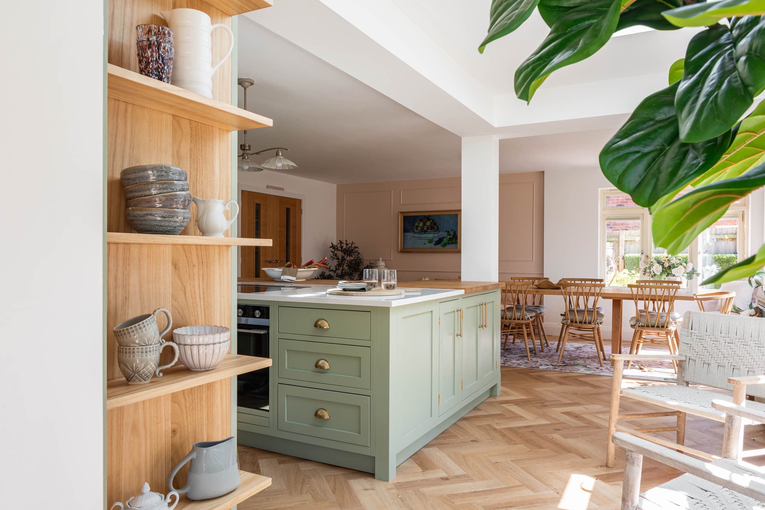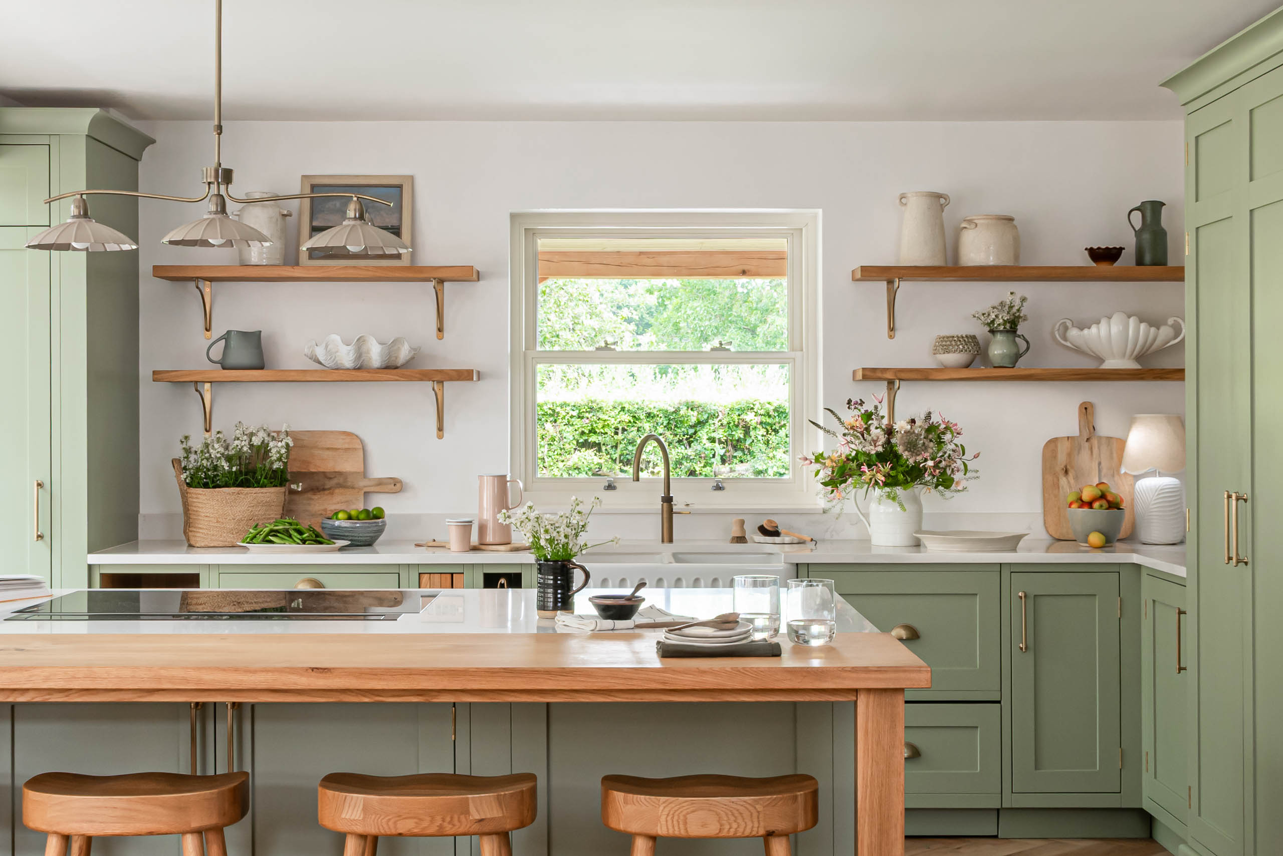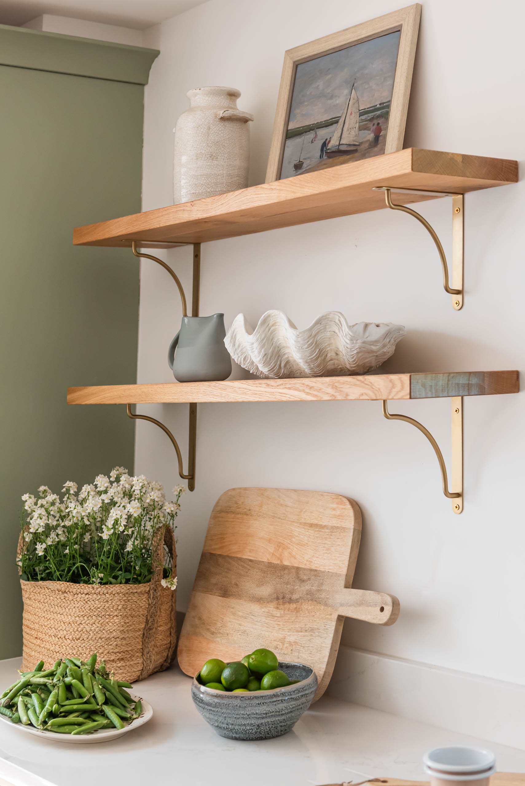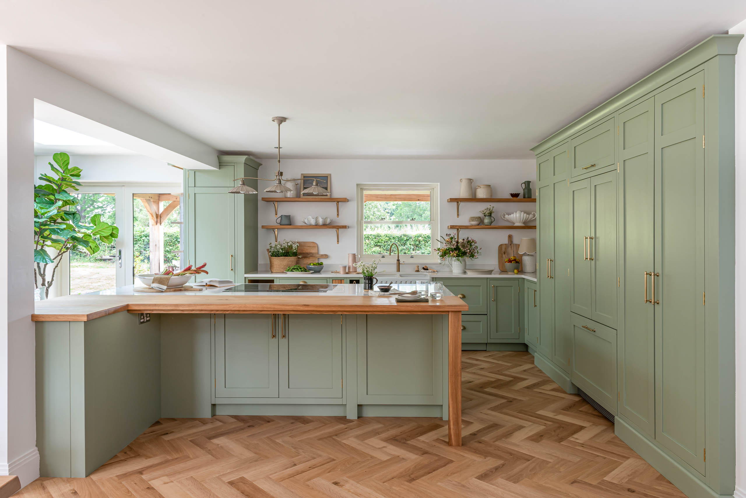 The kitchen now has our Shaker cabinetry, painted in Little Greene Boringdon Green, with polished brass hinges and Amerock Crawford handles in Golden Champagne. Silestone Calacatta Gold replaces the original dark granite, brightening the room alongside a new window. A large island sits in the centre, and a tall open bookcase finishes one end of the run. We designed and made bespoke open shelving, fitted with Corston Kilburn brackets in antique brass, and added a timber pillar detail to the island.