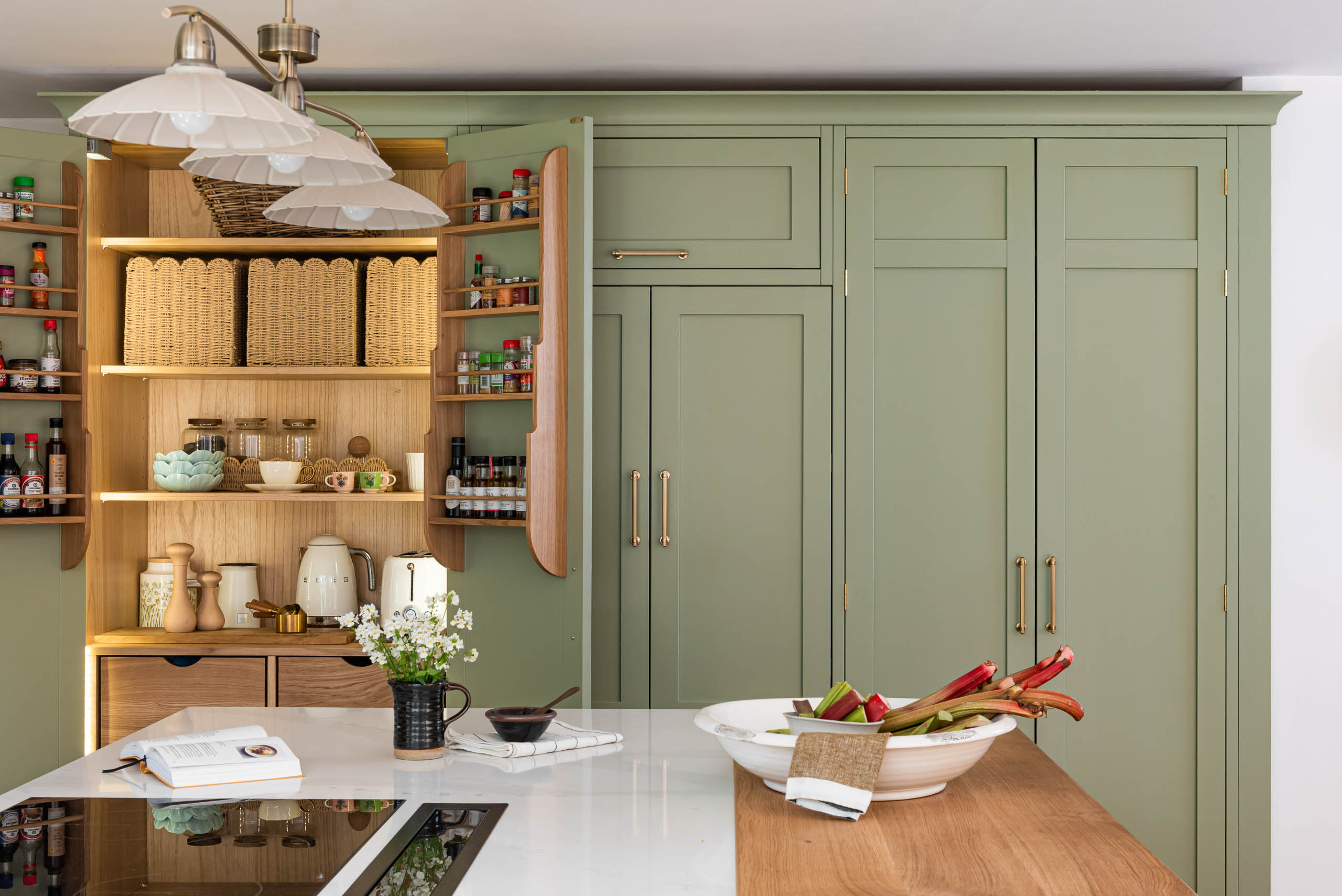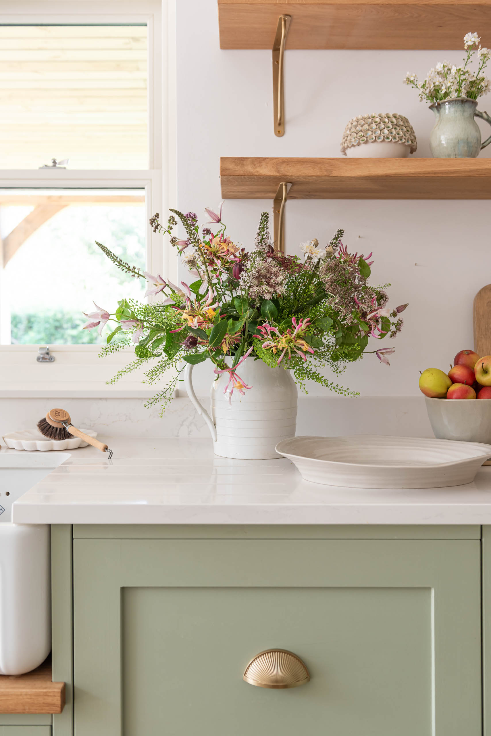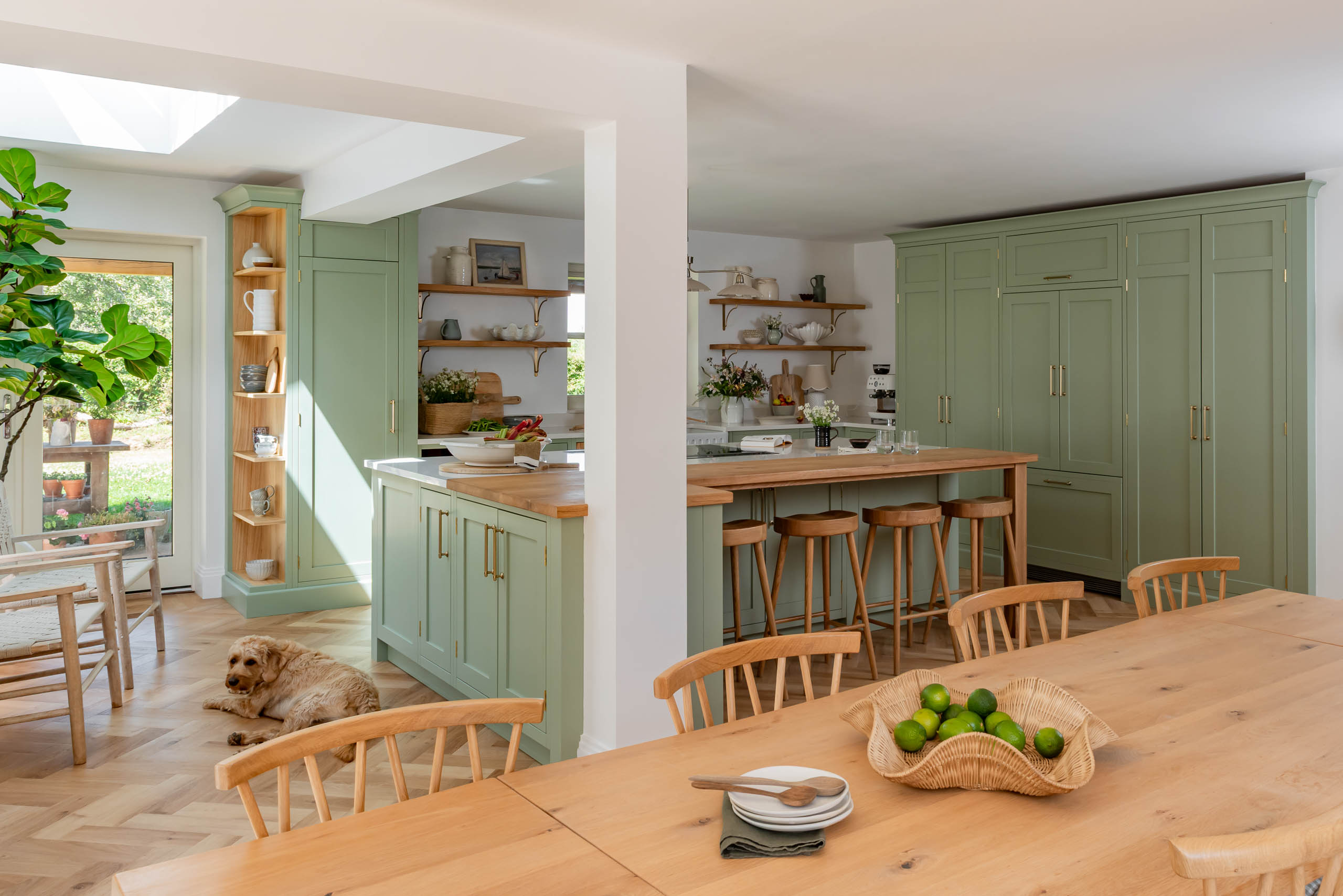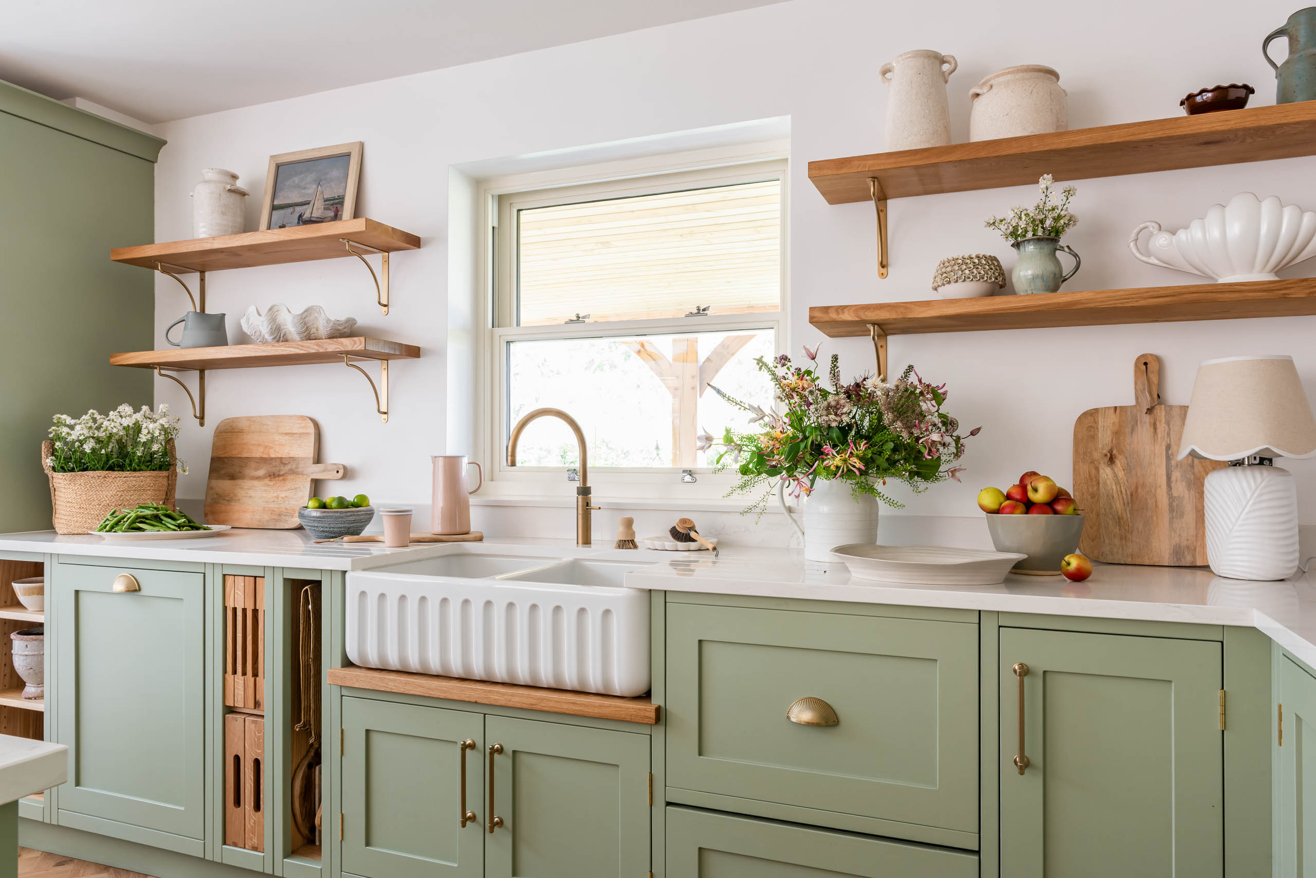 The kitchen now has our Shaker cabinetry, painted in Little Greene Boringdon Green, with polished brass hinges and Amerock Crawford handles in Golden Champagne. Silestone Calacatta Gold replaces the original dark granite, brightening the room alongside a new window. A large island sits in the centre, and a tall open bookcase finishes one end of the run. We designed and made bespoke open shelving, fitted with Corston Kilburn brackets in antique brass, and added a timber pillar detail to the island.
