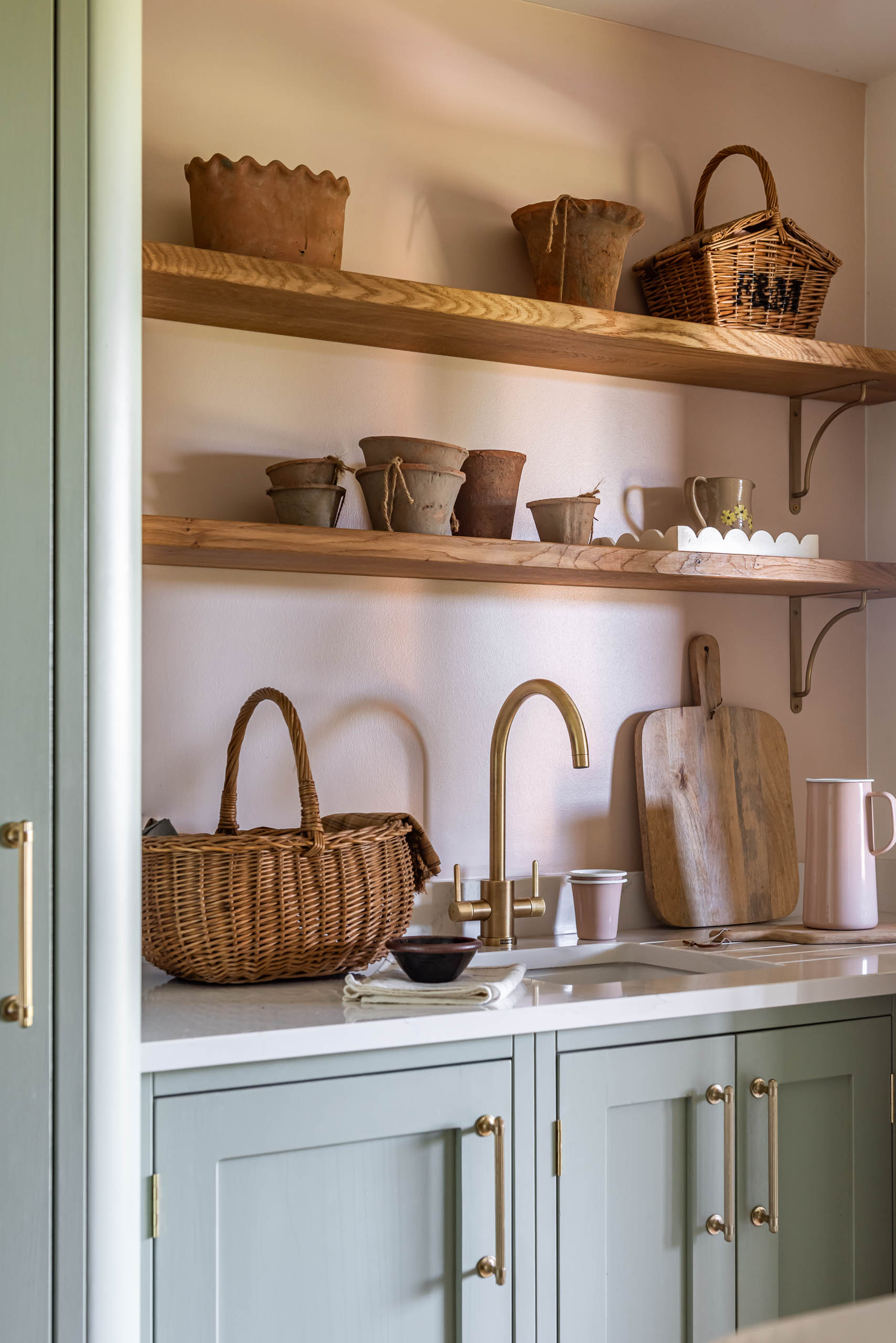 The same cabinetry and finishes continue into the laundry, with more bespoke open shelves for baskets and garden pots, and a built-in dog bed. A structural steel and a waste pipe had to stay in place, so we designed the joinery to conceal them, leaving the space tidy and uninterrupted.